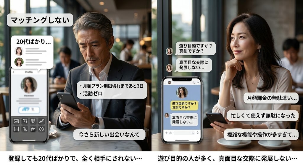 年齢を重ねるにつれて、職場やプライベートでの自然な出会いは急激に減っていきます。いざマッチングアプリを始めてみても、以下のような悩みに直面する方は少なくありません。