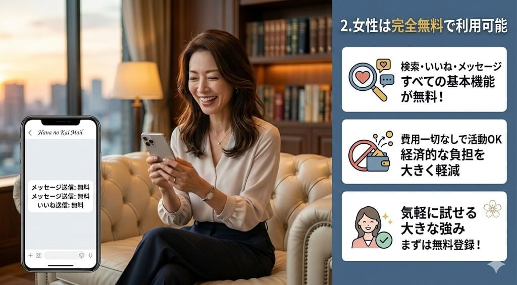 女性ユーザーにとって非常に嬉しいのが、登録から基本的な出会いの機能までを「完全無料」で利用できる点です。