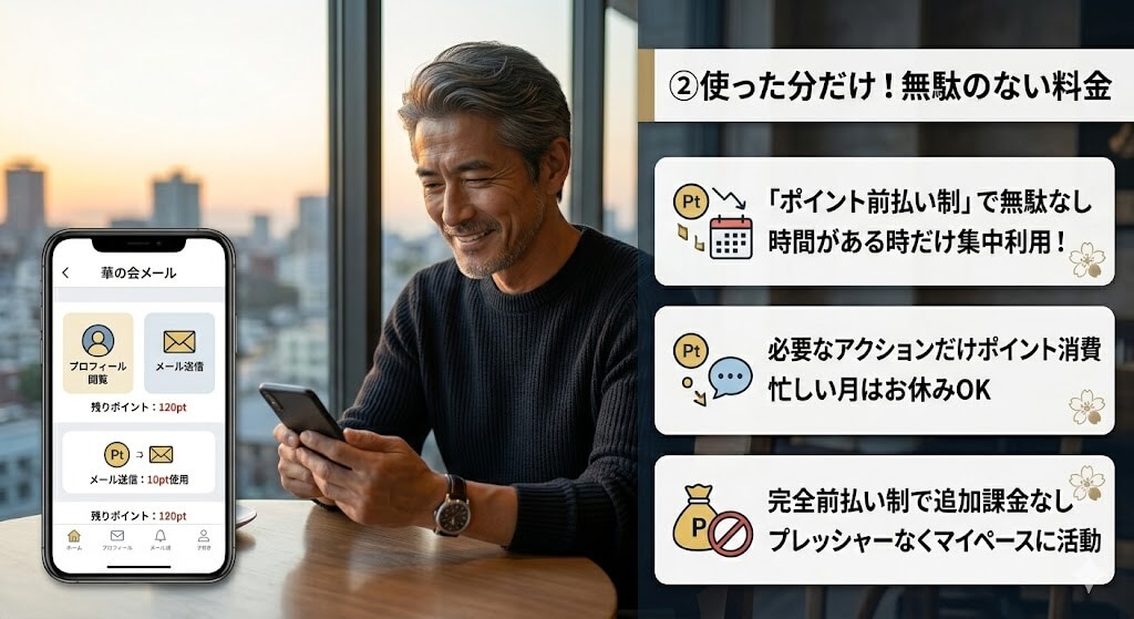 二つ目のメリットは、自分のペースに合わせて無駄なく利用できる「ポイント前払い制」です。現在主流の定額制アプリは、毎月一定の料金が引き落とされるため、仕事が忙しくてログインできない月があると、費用が丸々無駄になってしまいます。